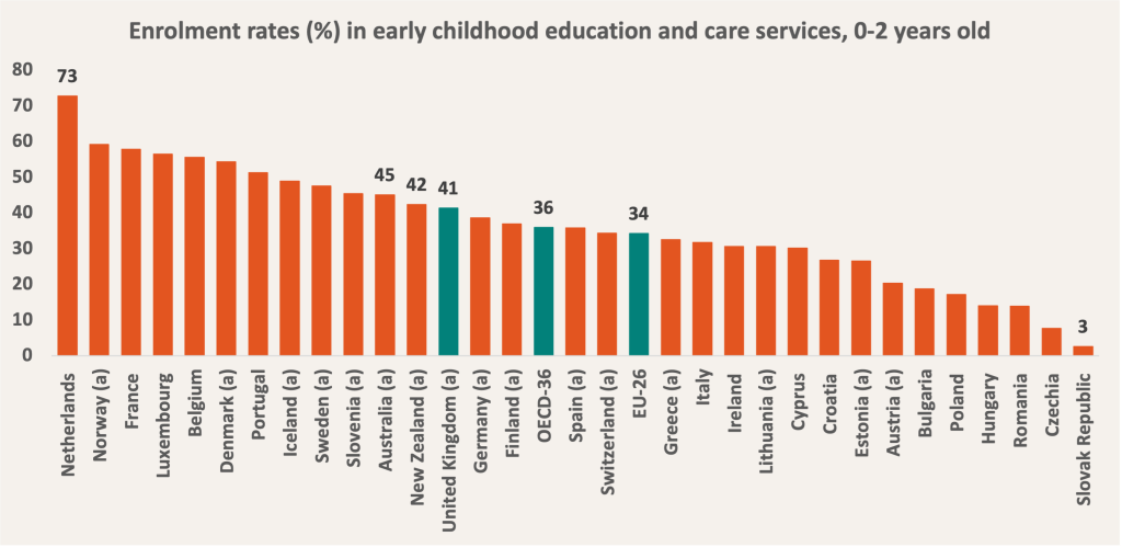 I went down a rabbit hole trying to find disaggregated data and even at international level it is difficult. The most relevant data I found was the data in the chart below, which shows that across the OECD, on average 36% of children ages 0 to 2 were enrolled in ECEC in 2022, albeit with a significant variation by country, from 70% (the Netherlands) to less than 10% (Czechia and Slovak Republic).