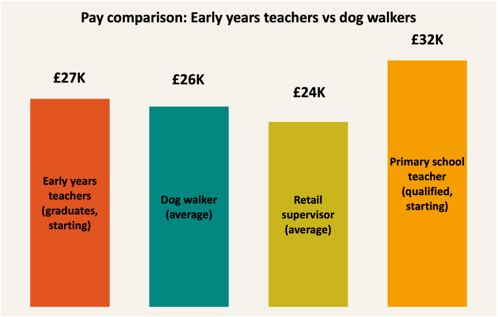 A graduate working full time in a nursery typically earns a starting salary of around £27,000 a year. That’s about the same as the average earnings for a dog walker. Yet these are the professionals trusted with the most formative years of a child’s life — shaping brain development, socio-emotional development, language, confidence and more.